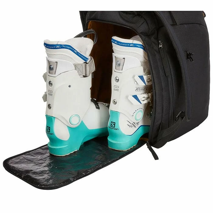 The Thule RoundTrip is a ski/snowboard boot backpack designed to keep your feet dry, your goggles safe and your gear organized. Store and transport boots in rear-loading compartment. Conveniently change in and out of boots in any location and keep feet dry by flipping down backpanel door for use as a standing mat.